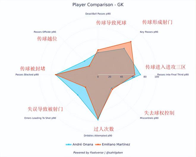奥纳纳本赛季好几次差点直接形成助攻的,他在国米效力的时候,就是以门将直接联系前锋出名的,所以本赛季的传球形成射门次数上,奥纳纳比马丁内斯更好。但是,把球传给对手方面,奥纳纳的次数也不少;而大马丁直接传球出界方面,数据更多。总体上,奥纳纳的失误更多,而大马丁在传球上相对稳定一些。